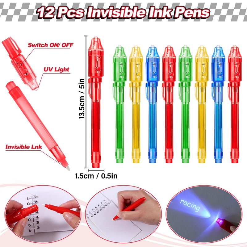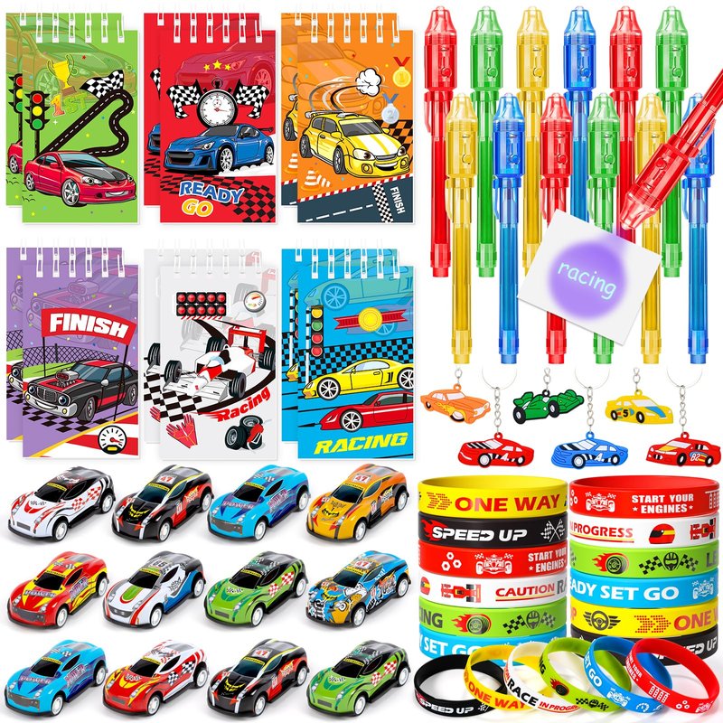 - 60Pcs Race Car Party Favors - This value pack includes 12 sets of race car favors, consisting of 12 invisible ink pens with UV light, 12 spiral notepads, 12 mini race car toys, 12 keychains, and 12 silicone bracelets. With a wide range of accessories, our race car party favors offer an extensive selection for your themed celebration.