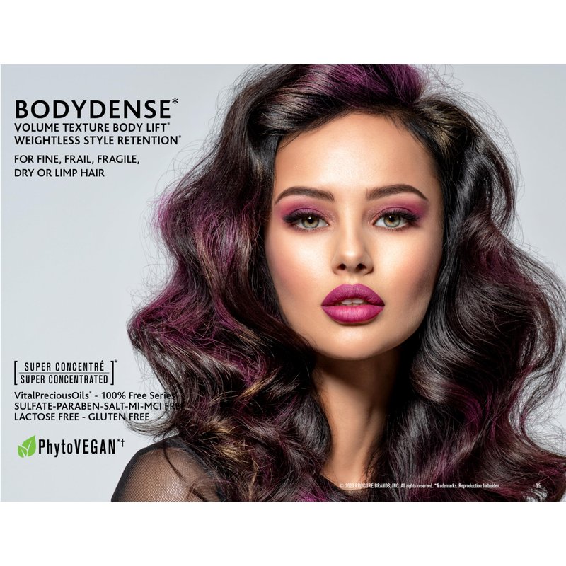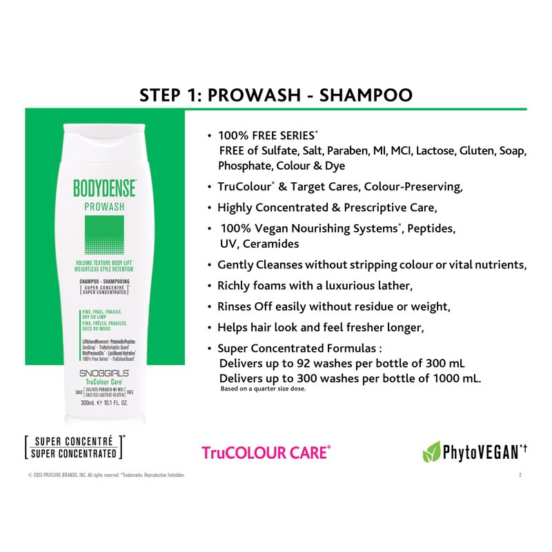 Volumizing shampoo This 100% Free Series* TruColour Care* super concentrated colour-preserving shampoo is Free of harsh Sulfates, Parabens, Salt and Gluten free. Its luxurious lather gently cleanses and helps nourish, revitalize, care and protect by deeply infusing colour-treated hair and scalp with rich 100% VEGAN Nourishing Systems, essential LipidBound Hydration*, fortifying Proteino-BioPeptides*, rejuvenating Lipids and Precious Oils, Ceramides and colour protecting nutrients. TruColourGuard* anti-fading system helps seal, protect, revive and prolong the purity, radiance and vibrancy of colour-treated hair. VitalPreciousOils* Antioxidant-Rich Defense Complex of Phyto-Lipids and Vital Oils, beautifies and helps protect and defend against the damaging effects of harsh chemicals, UVA/UVB, pollution, heat and styling stress. ZeroSnap* complex helps detangle and prevent hair breakage, frizz, static, and split ends. TruHydroLipidic Guard* helps protect and replenish the natural hydro-lipidic barrier for optimal hydration and elasticity. Helps soothe scalp. HydraRegulator Guard* locks in vital moisture and locks out excess humidity. Lightweight formula helps hair look and feel fresher longer. Hair Thermo-Protection. Bodydense* Weightless System deeply nourishes and helps treat, fortify, energize and protect hair. Helps infuse and add Extra Body, Weightless Volume, Lift, Strength, Dimension and Shine to the hair fiber for long-lasting Weightless Style Retention. Helps close, seal and fortify cuticles, locking in pure hair color vibrancy, moisture, force, texture and luminous shine. Locks out static and flyaways. Proteino-Biopeptides help deeply fortify from the inside out. Helps rebuild the intercellular matrix and cohesion to prevent the premature collapsing, weakening and dehydration of vital and essential support structures of hair, for long-lasting healthy looking Volume Texture Body Lift results and Fluidity of Movement. Lightweight, does not weigh hair down.
