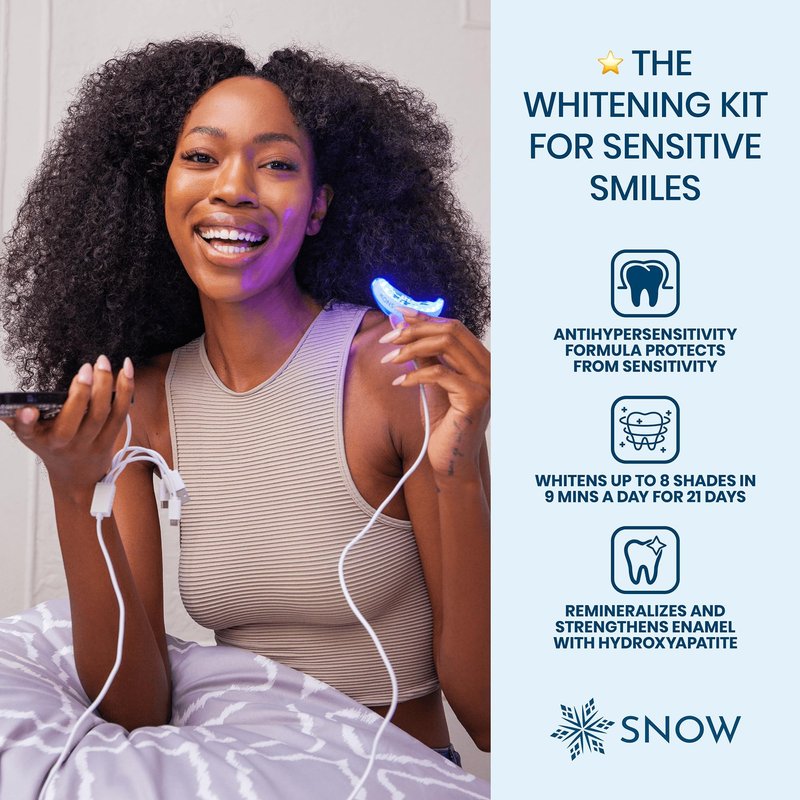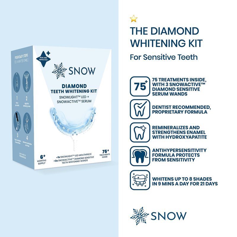 - QUALITY TEETH WHITENER: Our proprietary advanced teeth whitening system uses LED activating technology to affordably offer professional results. The Snow whitening kit includes three (3) Diamond Teeth Whitening Serums, an accelerating LED mouthpiece, and a shade guide. It's highly portable, so you can use the kit at home, the office, or the gym.