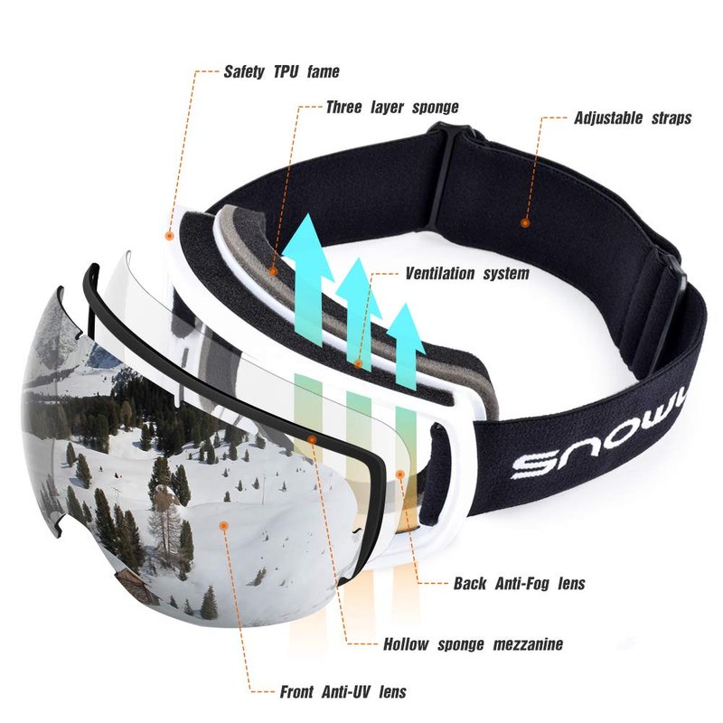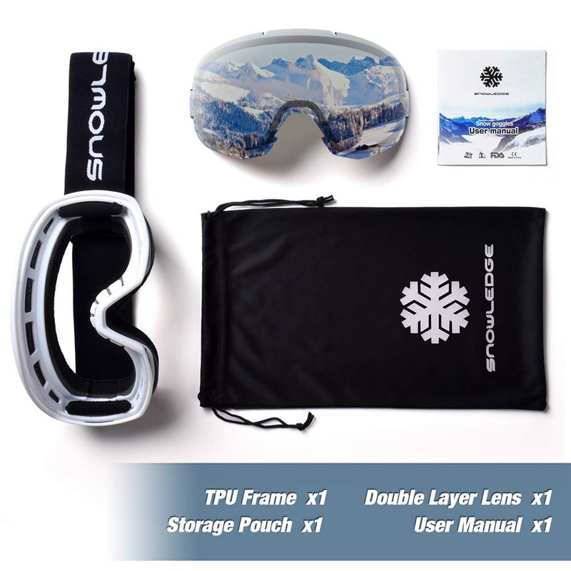 - 【Dual layer with anti-fog lens】 Snowledge skiing goggles adopts spherical dual lens, designing with Italy pro long-lasting technology. Anti-fog materials & anti-scratch coating offer you a fog free, unobstructed view