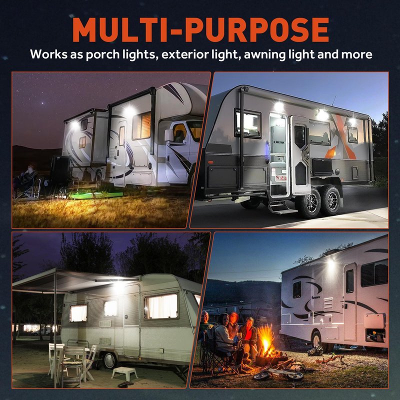 - ✅【6PCS PREMIUM ETI LEDS】RV exterior light led adpots high intensity led,producing 750 lm per light. The spread irradition range of RV lights exterior are 65 degree in horizontal spread X 69 degree in vertical to avoid falling and injury in the visual blind area, farewell to the darkness.