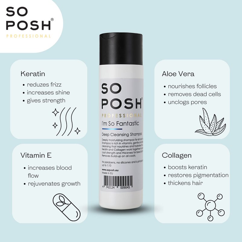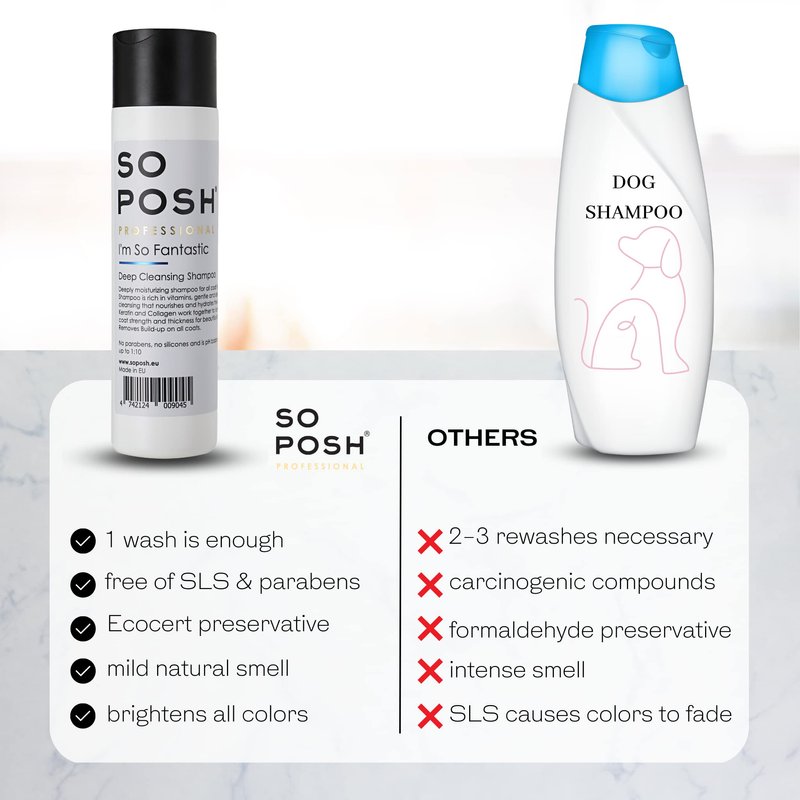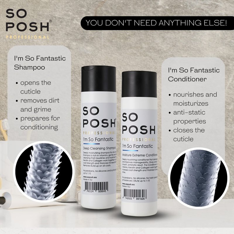 - Highest Quality Ingredients for Easier Coat Management - Our shampoo, free of allergens, harsh preservatives, SLS, parabens, and silicones, ensures your pet's safety. For an anti-static, smooth, and shiny coat that's easier to manage, use our 'I'm So Fantastic' Conditioner after washing. Enjoy the ease of detangled, lustrous, and manageable fur with SO POSH.