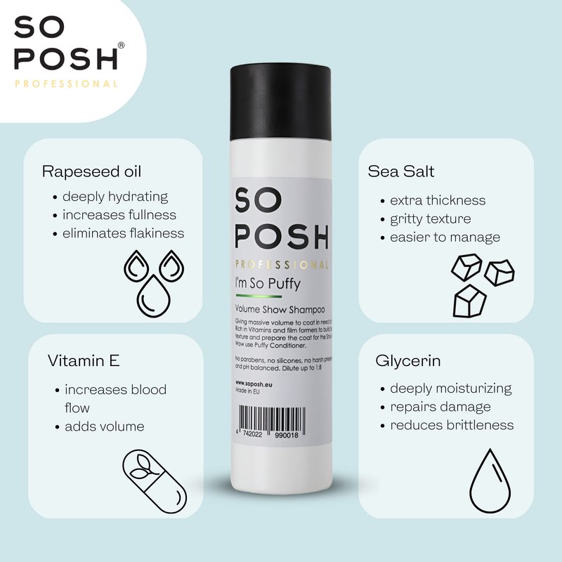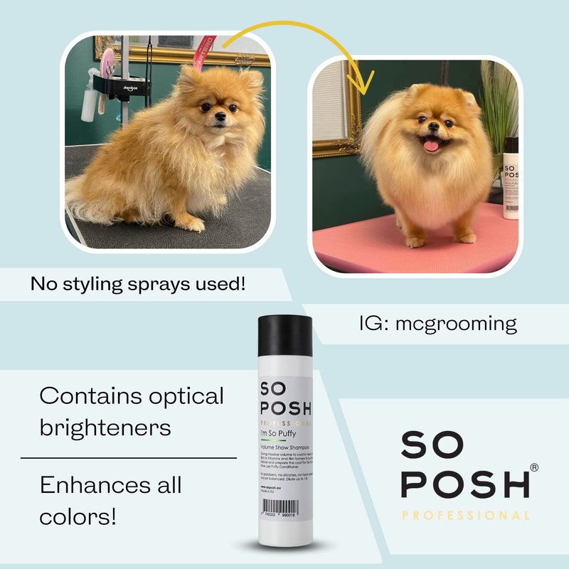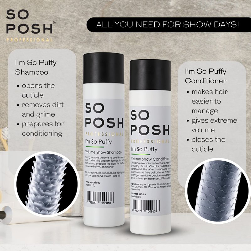 - SO POSH products are formulated for professional usage - For the ultimate show-dog finish with massive volume, use our 'I'm So Puffy' Shampoo, followed by the So Posh I'm So Puffy Conditioner. This professional-grade duo guarantees a voluminous and radiant coat, just like a show dog. With SO POSH products, give your furry friend the luxurious treatment they truly deserve.