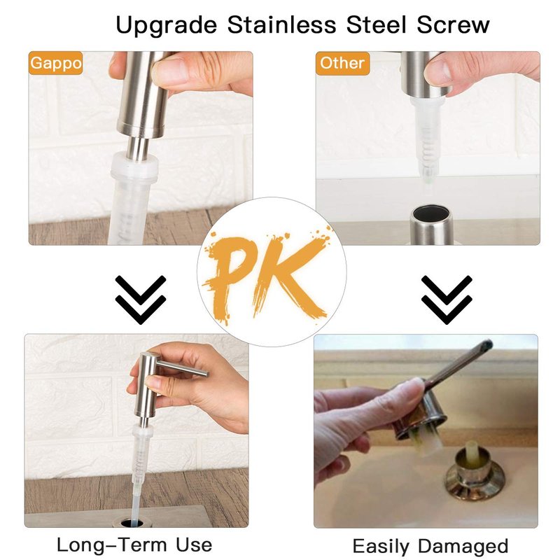 - Stainless Steel: This soap dispenser is made of commercial grade stainless steel and PE plastic, upgrade stainless steel screw for higher durability and reliability