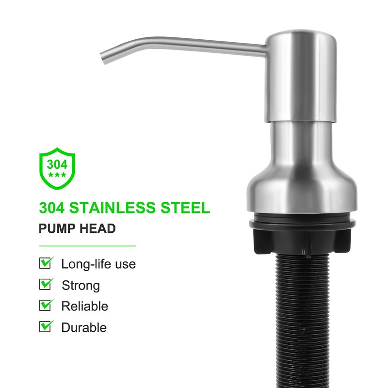 - Premium Material:This sink soap dispenser for kitchen sink is made of durable 304 stainless steel and PE plastic. This soap dispenser pump head possesses long-lasting performance and can survive over 50,000 press tests. Not only waterproof, and is perfect for damp environments.