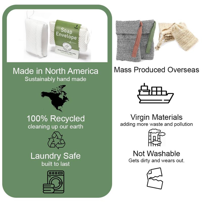 - MADE WITH 100% RECYCLED MATERIALS - our Soap Envelope bar soap bag is proudly made from a custom-woven proprietary fabric that is made from ocean and landfill bound water bottles. One pack of our Soap Envelope bar soap bag is equal to 3 recycled bottles.