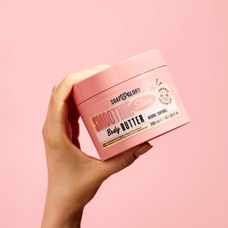 Soap & Glory's Smoothie Star Body Butter for women is all you need to lock in moisture and leave skin feeling irresistibly soft. Enriched with skin-quenching ingredients including Vitamin E for skin barrier protection, and cocoa butter. Add coconut butter supplies a major hydration boost. But wait! It gets even butter... twist open the lid to be transported on a glorious journey of discovery as you immerse yourself in the luscious world of Smoothie Star. Enjoy the delicious finish of sandalwood, vanilla and caramel to leave skin delicately scented all day long. Smoothie Star works as a body butter for women dry skin in need of some moisture. Our vanilla dream coconut body butter leaves skin feeling moisturized and smooth. Our formula is enriched with Vitamin E, whipped shea butter for skin soothing, and coconut & cocoa butters to help skin feel smooth and hydrated. Long-lasting nutty fusion fragrance to be used after after Smoothie Star Body Wash and Body Scrub.