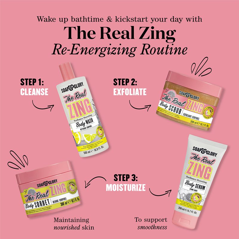 Introducing our The Real Zing Body Scrub - enriched with serious skin scrubbers. Combines a sea salt scrub and smashed sugar scrub, that work to truly buff away dead skin cells leaving behind nothing but smoothed and cleansed feeling skin. With an AHA fruit complex, not only does it work wonders on dry legs and elbows, but it leaves skin feeling refreshed, re-energized and looking positively glowing! A positively pampering pick-me-up infused with a refreshing citrusy fragrance blend of lemon, lime and neroli, to refresh the senses. Decadently delicious…