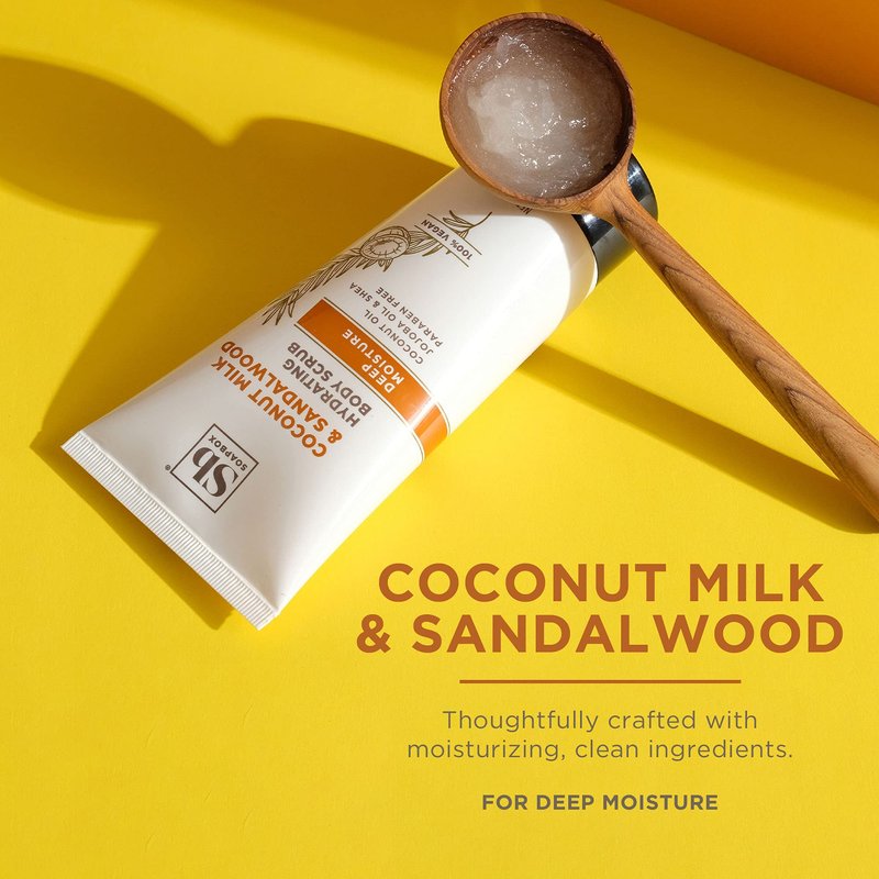 - Exfoliating body scrub. Buff away dull skin with this sugar scrub featuring coconut milk & sandalwood in a blend of coconut oil, jojoba oil & aloe. Skin is silky smooth & deeply hydrated.