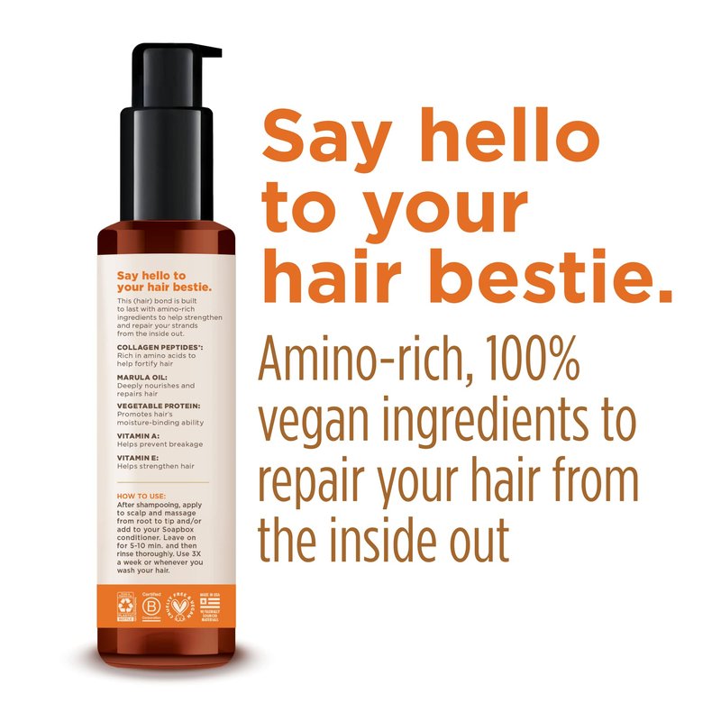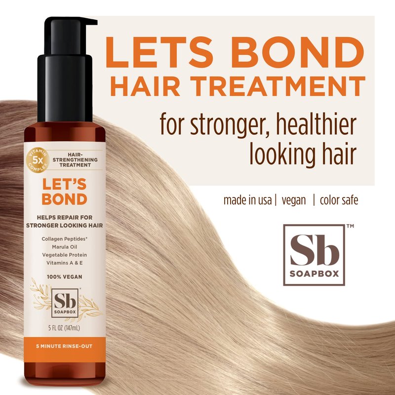 - 5 MINUTE RINSE, 3 X A WEEK is all it takes for beautiful, soft and manageable hair. Simply shampoo and condition with Soapbox vegan hair care, then add Lets Bond in from root to tip. Rinse after 5-10 minutes.