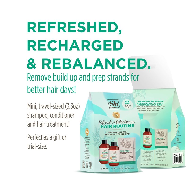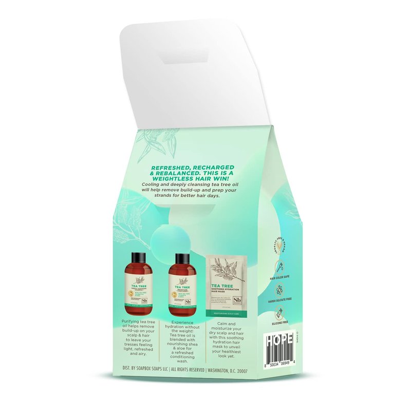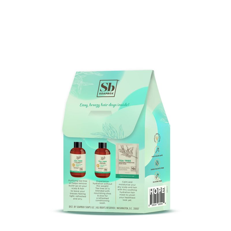 Soapbox Haircare Gift Set of 3, Travel Sized Shampoo & Conditioner with Tea Tree Oil + Scalp Treatment to Cleanse Build Up, Cleansing Hair Care Set of Three in Gift Box Easy, breezy hair days inside! Refreshed, Recharged and Rebalanced. This is a weightless hair win! Cooling and deeply cleansing tea tree oil will help remove build-up and prep your strands for better hair days. tea tree shampoo: Purifying tea tree oil helps remove build-up on your scalp & hair to leave your tresses feeling light, refreshed and airy. tea tree conditioner: hydration without the weight! Tea tree oil is blended with nourishing shea & aloe for a refreshed conditioning wash. scalp treatment: moisturize your dry scalp and hair with this soothing hydration hair mask to unveil your healthiest look yet.