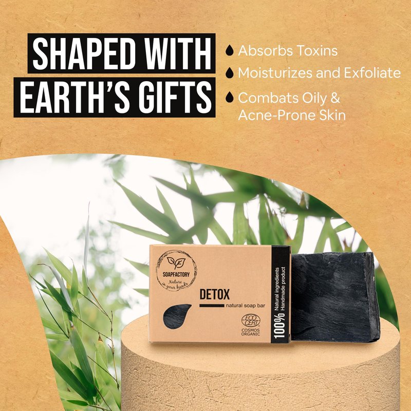 - BLACK SOAP BAR WITH CHARCOAL: Activated charcoal absorbs toxins and environmental pollutants from the body and leaves the skin feeling clean and refreshed, without drying it out