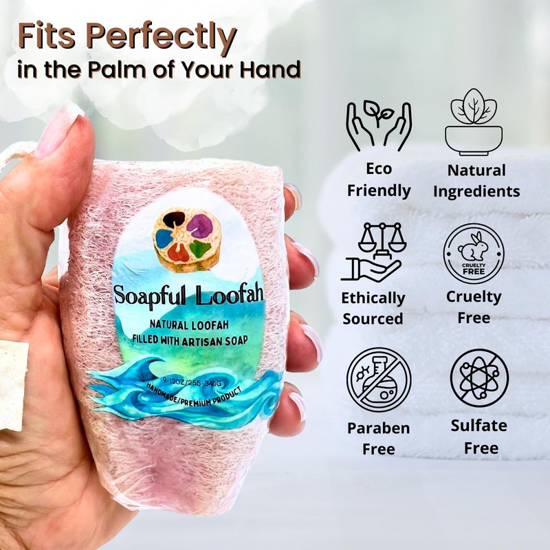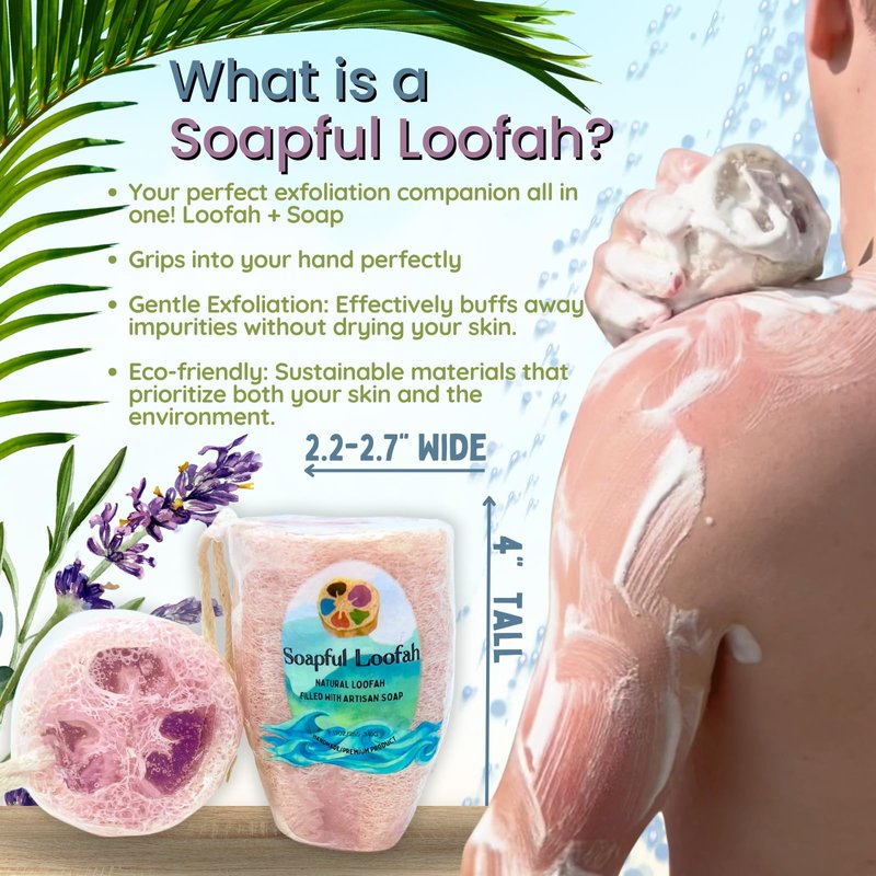 - ✨THE FIRST OF ITS KIND: Unlike any other exfoliating shower loofah soap, Soapful Loofah’s Unique design makes it easier to grip onto, even with a luxurious lather. Naturally grown unbleached body loofah & natural vegetable glycerin soap with essential oils, natural fragrances & natural colors made by nature.