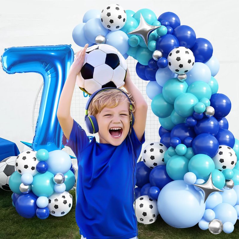 - Soccer 7th Birthday Party Supplies Set: Soccer birthday decorations kit including: 1Pcs 40inch blue number balloons, 3pc 3D soccer foil balloons, 2pc star foil balloons, Pastel blue balloons (18'' 1pcs+10'' 20pcs+5'' 8pcs), Printed football balloons (12'' 10pcs), Royal blue balloons (10'' 10pcs+5'' 8pcs), Teal blue balloons (10'' 15pcs+5'' 8pcs), Metallic Silver balloons (5'' 8pcs), stripe tape and sticky dots. Enough for your kid’s Soccer football birthday party.