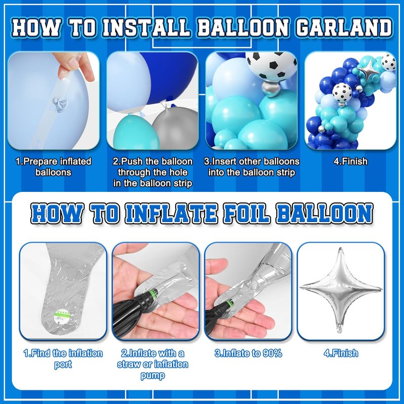 - Best Gift For Your Kids: With the free accessories and manual, it's easy for you to create the balloon garland.Firstly, make mixed color balloons inflatable, then stuff the knot into the hole of the balloon arch chain. You can hang them on trees, walls, windows, doorways, dining tables and anywhere you like. Delight your child with this complete set of Soccer football Birthday party supplies.