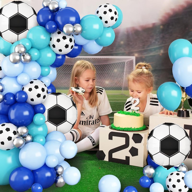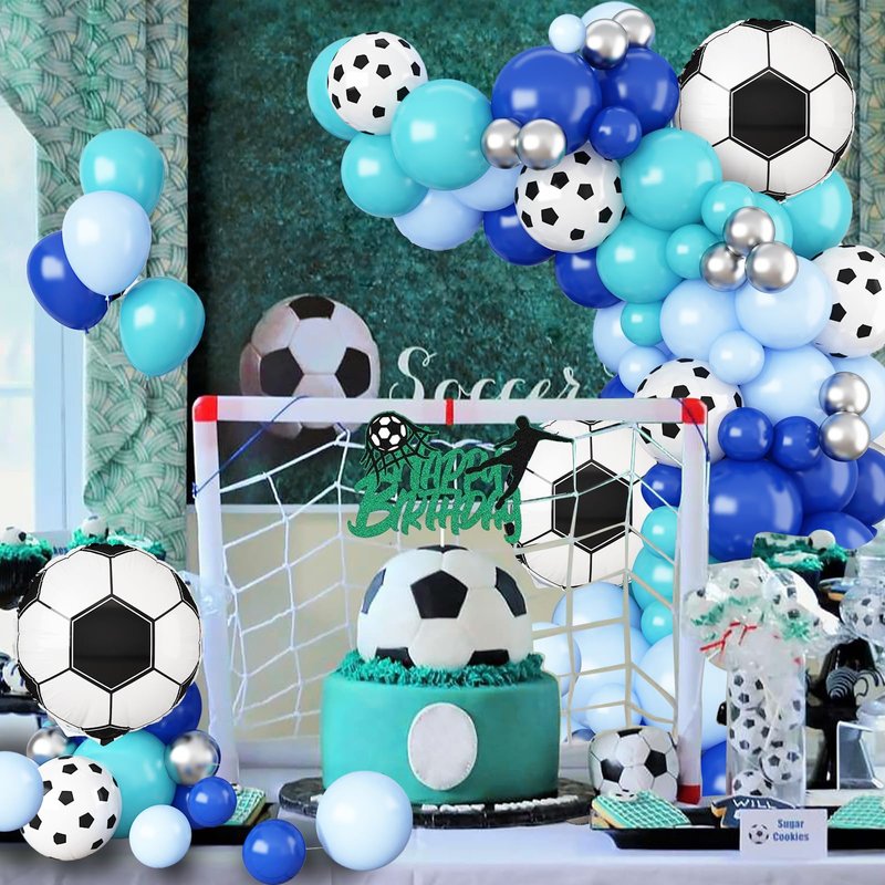 - 【Balloon Garland Kit】The soccer balloon arch kit includes:23 royal blue balloons, 24 maca blue balloons, 24 teal blue balloons, 15 white balloons, 3 soccer foil balloons, 15 football print balloons, glue dispensing, 5m balloon chain and 10m ribbon.