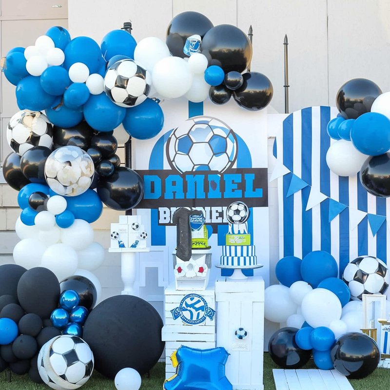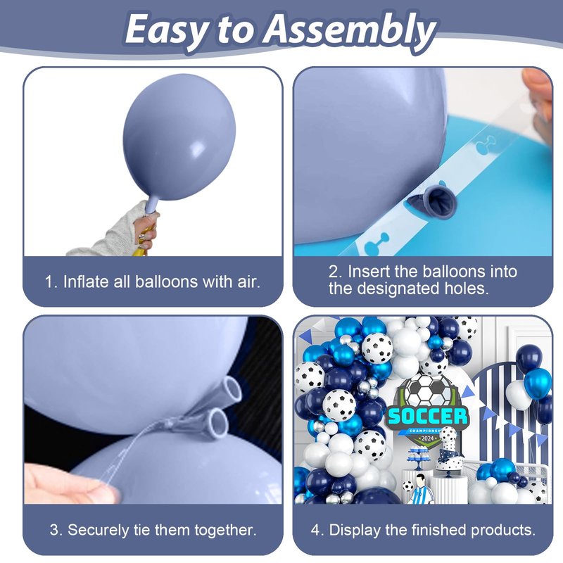 - 【Soccer Balloon Arch Kit】The Soccer Garland Kit includes a colorful balloon kit in various colors and sizes:1pc 18-inch balloons (Navy Blue*1),32pcs 12-inch balloons (Navy Blue*12, Metallic Blue*8, White*12),31pcs 10-inch balloons (Navy Blue*12, Metallic Blue*8, White*11),30pcs 5-inch balloons (Navy Blue*6, Metallic Blue*6, White*6, Metallic Silver*12),Soccer Foil Balloons*8,Accessories(Balloon Chain*1,Dispense*3,White Ribbon*1)