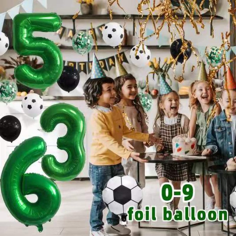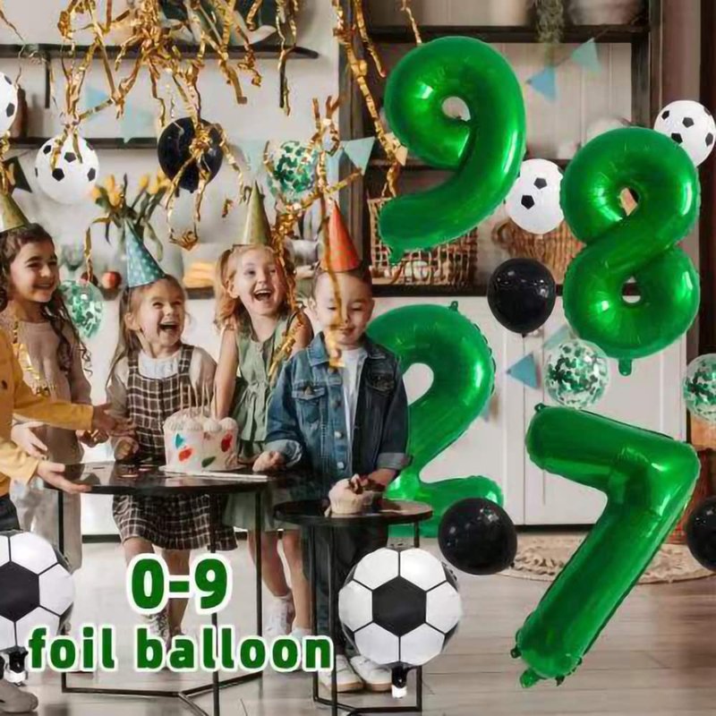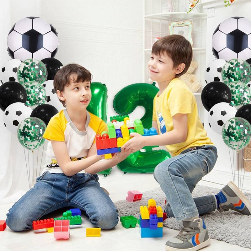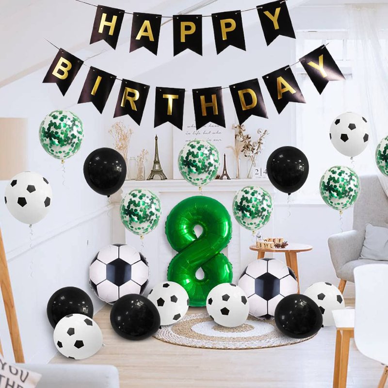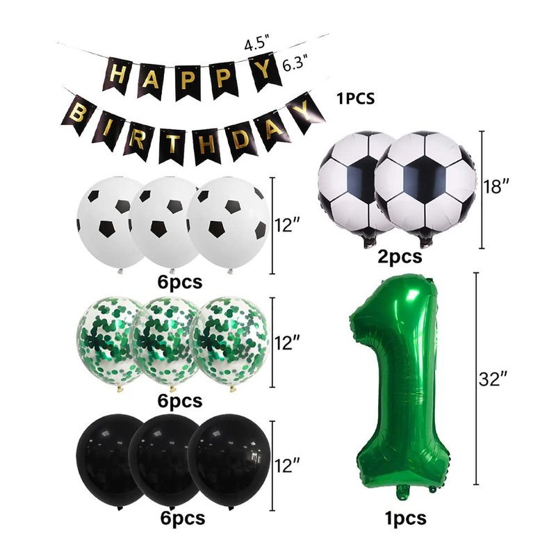 - 22 piece set: 1x 32 inch number 7 number balloon, 1x "Happy Birthday" banner,2x 18 inch soccer balloon, 6 x 12 inch soccer latex balloon, 6 x 12 inch green confettiballoon, 6 x 12 inch black latex balloon