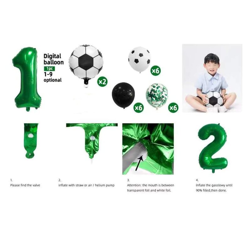 22 Piece Soccer Themed balloons for Sports Themed Birthday, Baby Shower, Graduation Party Decorations Soccer Balloon are made of safe aluminium foil Package Included: 1x 32 inch number 7 number balloon 1x "Happy Birthday" banner 2x 18 inch soccer balloon 6 x 12 inch soccer latex balloon 6 x 12 inch confettiballoon 6 x 12 inch black latex balloon