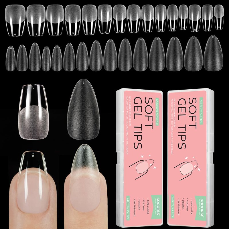 SOCORIA Soft Gel X False Nail Tips 2 Styles Kit - Medium Coffin, Medium Almond 480PCS Pre-shaped Matte Full Cover Acrylic Fake Nail Tips for Nail Extension DIY Manicure Salon Home 15 Sizes