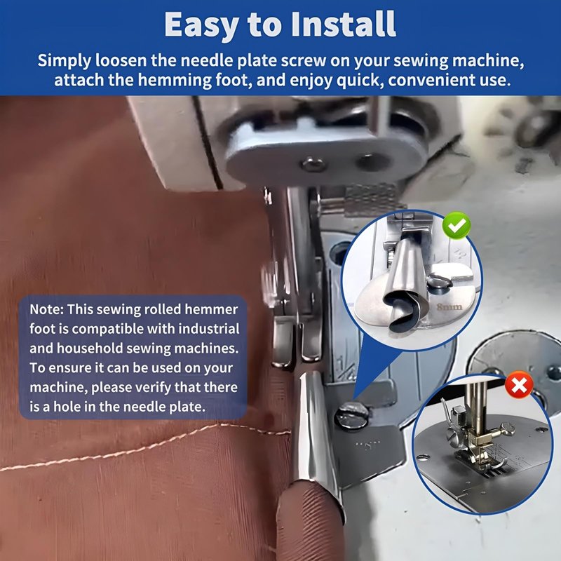 Say goodbye to complicated setups. Our rolled hem pressure foot is specifically designed for easy installation. Simply loosen the needle plate screw on your sewing machine, securely attach the hemmer foot, and you're ready to dive into your sewing projects with efficiency and convenience.