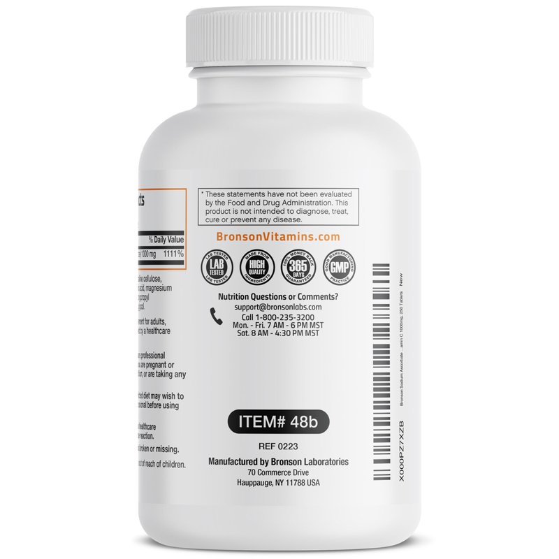 A non-acidic form as sodium ascorbate provides a Vitamin C that is gentle on the stomach. Vitamin C is a water-soluble vitamin found in citrus fruits, green and leafy vegetables, tomatoes and cauliflower. In addition to the formation of collagen, vitamin protects the body from potentially harmful free-radicals. Vitamin C is also effective in helping to maintain a healthy immune system. The body cannot make or store vitamin C, so it must be replaced every day. Bronson Labs backs their products up with a 365-day hassle-free guarantee. If you aren't completely satisfied, simply contact us and we'll give you a full refund, no questions asked.