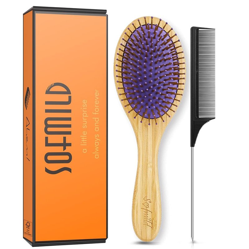 Sofmild Bamboo Wooden Paddle Hair Brush Comb Set, Hairbrushes for Women Men Kid Detangling Hair Massaging Scalp with Round Tip Bristles for All Hairstyles(Purple Wooden)