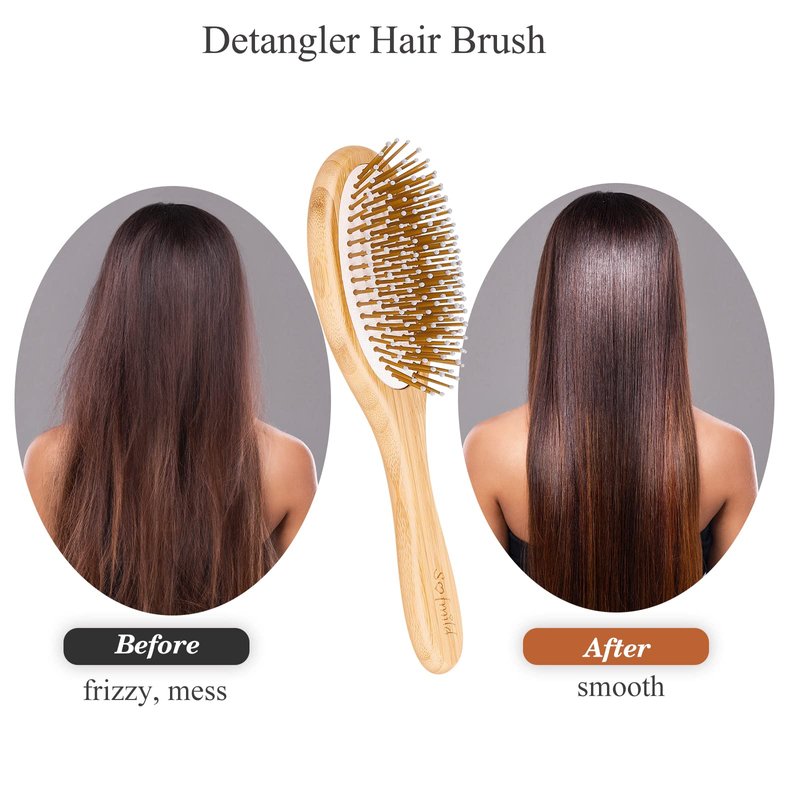 - Natural Material: The main body of our hairbrush is made from bamboo and the cushion is made from natural rubber, which is a more sustainable option for the environment.Bamboo is one of the most sustainable materials on Earth because of its rapid growth cycle. Natural rubber has the attractive properties of hypoallergenic and durable.