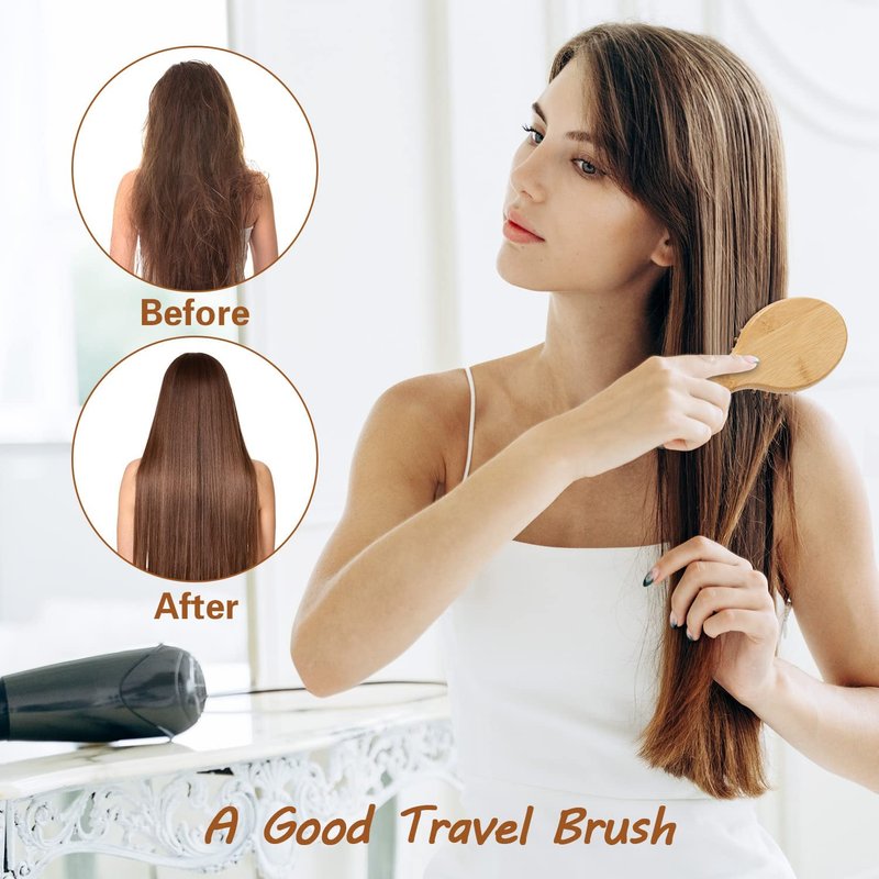 - Mini Detangler Hair Brush (Size 5.51*2.36 inches): Mini travel bamboo brush that helps hair healthy.Gently loosens knots on wet or dry hair without pulling or snagging