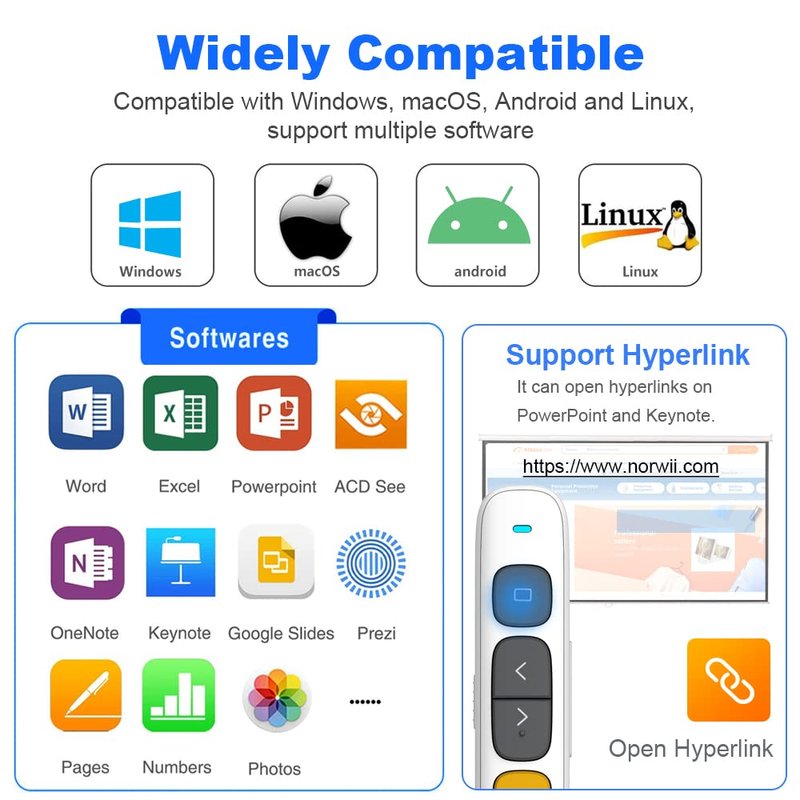 - Widely Compatible - ①THis presentation clicker usb c support operating Systems: Windows, macOS, Linux, Android; ②Powerpoint remote supports software: PowerPoint, Google Slides, Keynote, PDF, MS Word, ACD See, Website, iWork (Keynote & Numbers & Pages), Prezi etc.