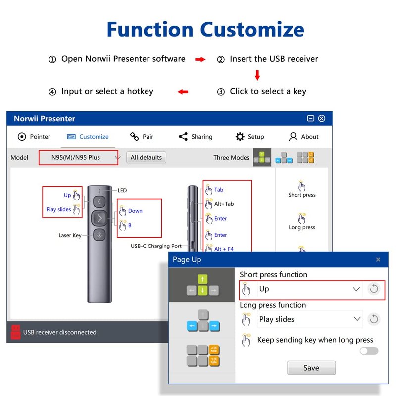 - Plug & Play Presentation Remote Rechargeable - ①Norwii N95 powerpointer clicker with laser pointer supports Hyperlink Page Up/Down, Black/Full Screen, Switch/Close Windows. ②Besides, slide clicker supports Key-customized Function (Need download software from our official website), buttons can be customized as Media Play/Pause, Previous/Next Track, etc. ③ PPT clicker is easy to use, just Plug & Play.