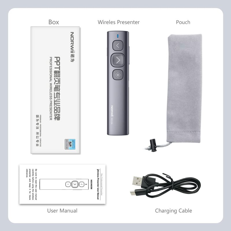 - What You Get - Package list: 1x Powerpoint Clicker Rechargeable, 1x USB-C Charging Cable, 1x USB-A Receiver, 1x Gift Pouch, 1x User Manual. For key-customized function, you need to find and download the software from “norwii dot com” website to achieve.