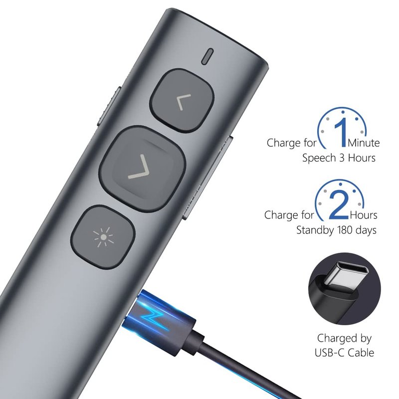 - Rechargeable - Built-in 300mAh rechargeable battery provides weeks of use on only a 2-hour charge. Long Control Range - Best choice for large-scale presentations, computer clicker range: 100M/330FT, Red light distance: 200M/656FT. Bright Red Light - This projector remote control presentation produces a bright red light that's easy to see against most background (Not recommended for led/ lcd/ tv screens).