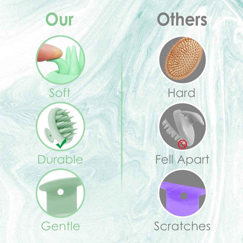 - 【INSTEAD OF NAILS】 Instead of those shampoo brush with short and hollow bristles, this upgraded scalp brush is made from ultra-soft, solid and longer food-grade silicon for sensitive scalp. This waterproof scalp exfoliator brush can be used in the shower or for dry scalp care anywhere. Girls with thick, oily, curly and wavy hairs love this great product especially, since it will not pull and hurt their luxurious hair.