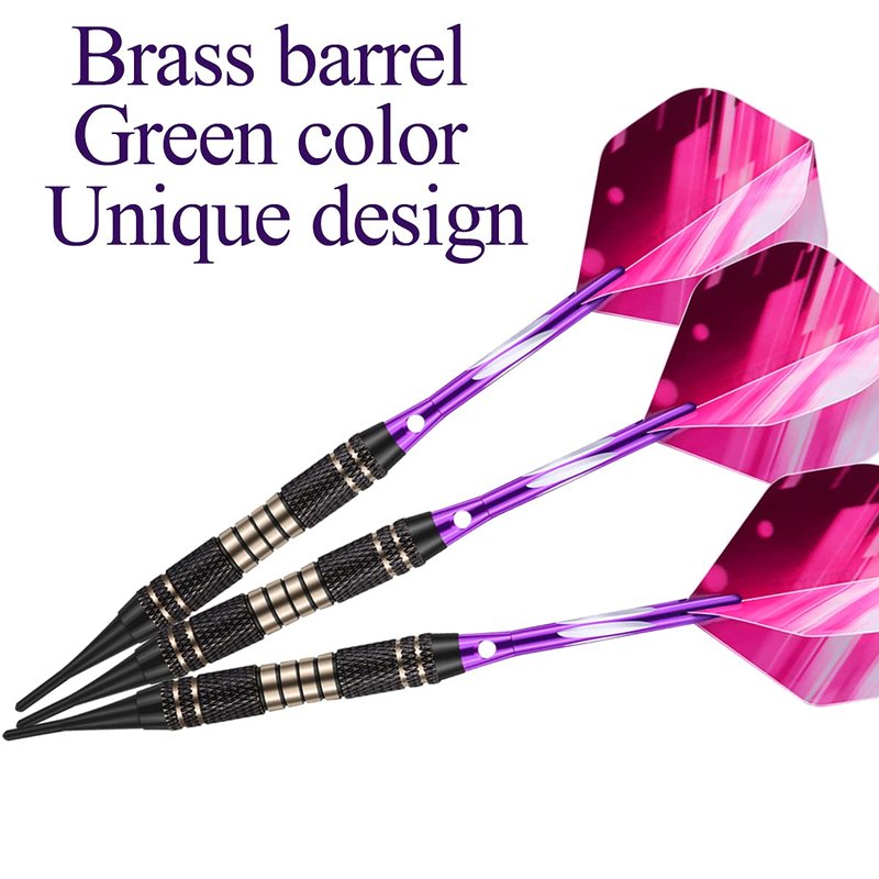 - TAKE YOUR DART GAME TO NEXT LEVEL ----- The darts soft tip set provide superior accuracy & exact targeting that will help to hit the bullseye easily; unique design brass barrel, durable alumminum shaft and high speed flights together offer great power & comfort in hand that stimulate your throwing at every time;