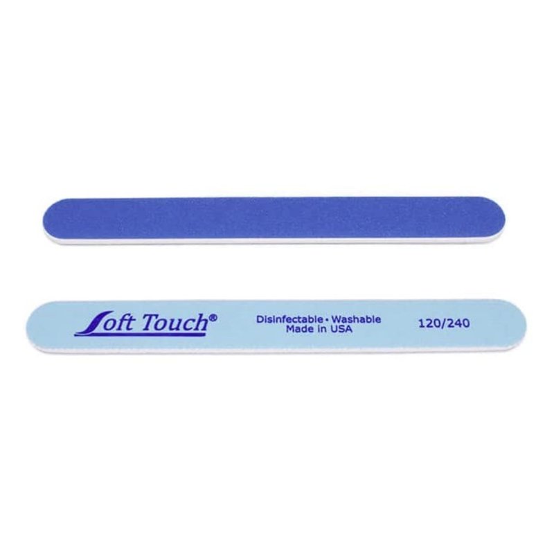 SOFT TOUCH NAILS – THE PROFESSIONAL MARK OF EXCELLENCE Welcome to Soft Touch, the leader in USA manufactured professional products for the nail care industry. Trusted by distributors, leading salons, spas, and stylists since 1979, we offer tremendous value on nail care supplies. This Coarse/Fine nail file is a gentle 120/240 grit Acrylic and Gel Nail file. Use the Dark Blue side for shaping and the Light Blue side for finishing. Also, can be used to file toe nails. Washable.