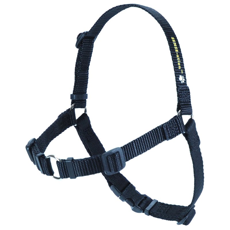 The original SENSE-ation Harness is a no-pull dog harness that works wonders for positive reinforcement dog training, or just taking gentler walks with your pooch. An instruction booklet comes with all SENSE-ation Harnesses. The SENSE-ation is similar to the SENSE-ible Harness in design, however the SENSE-ation uses a custom Softouch polyester webbing for added comfort. The SENSE-ation Harness also features Duraflex plastic hardware, instead of metal. The O-rings on the chest and sides are nickel plated steel for extra durability. The curved side-release buckle and strap keepers are a plus. The girth strap, also called a "belly strap" comes in a coordinating color, making it easy to identify, and therefore easier to put on. The SENSE-ation Harness stops your dog from pulling, without choking, stress or otherwise harming your pet. You can use i right away - there is no acclimation period. Best of all, the SENSE-ation Harness is a favorite of positive reinforcement dog trainers and humane societies worldwide. Awarded "Gear of the Year" by The Whole Dog Journal, 2003. IMPORTANT: Make Sure To Measure Your Pet's Girth To Ensure You Are Buying The Correct Size: Using a flexible measuring tape, measure from just behind the front legs all the way around your dog. You are measuring the circumference of the body just behind the front legs, like performing a chest or belt measurement on a human. X-Large 1 Inch Width 39 - 50 Inch girth*. Large - 1 Inch Width 32 - 40 Inch girth*. Large - 3/4 Inch Width 31 - 40 Inch girth*. Medium/Large - 1 Inch Width 27 -32.5 Inch girth*. Med /Large - 3/4 Inch Width 26 - 32 Inch girth*. Medium - 1/2 Inch Width 24 - 28 Inch girth*. Small - 5/8 Inch Width 20 - 24.5 Inch girth*. X-Small - 7/16 Inch Width 16.5 - 20.5 Inch girth*. Mini - 7/16 Inch Width 13 - 16.5 Inch girth*. * If the measurement falls within two harnesses, we suggest the larger size. Example: 20" girth = Small.