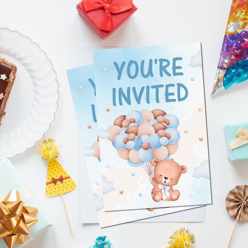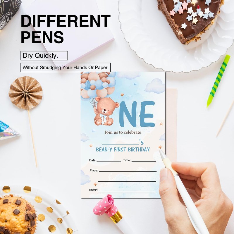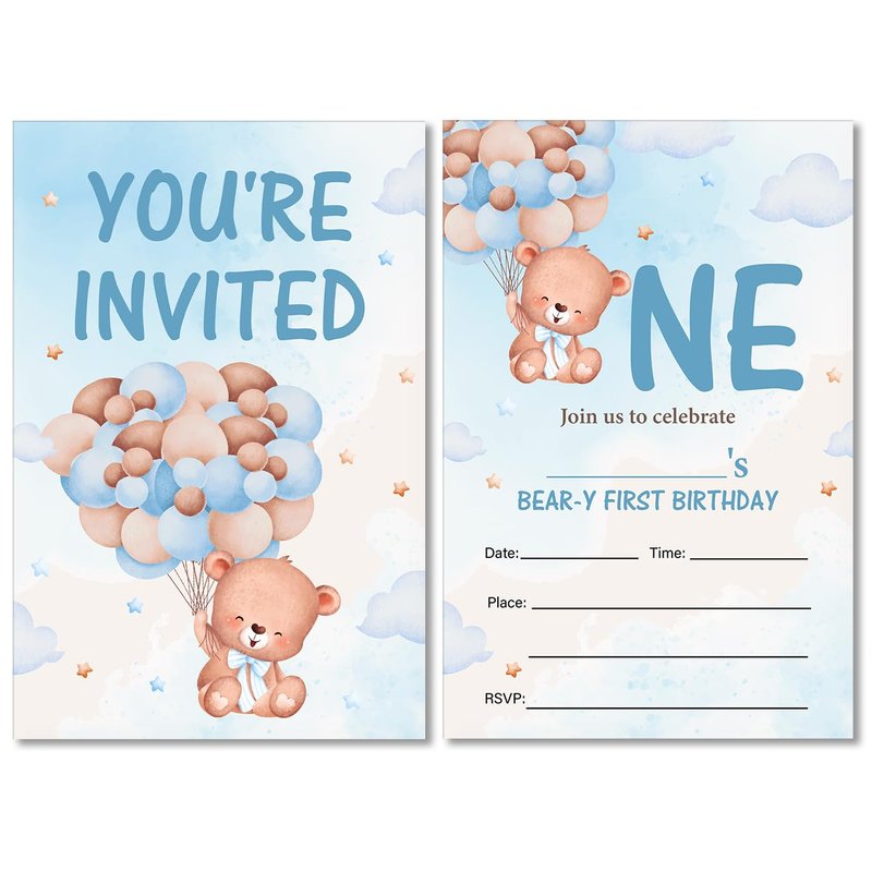 Soiceu Blue Bear Boy First Birthday Invitations with Envelopes Set of 20 Watercolors Bear Balloon 1st Birthday Party Invites Fill in Blank