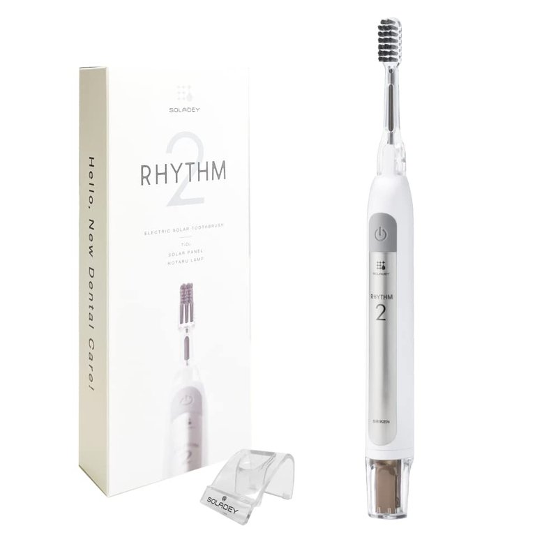 [SOLADEY RHYTHM 2] Remove stubborn plaque and fight off cavity-causing bacteria the whole night through. RHYTHM2 is a brand new type of brush that harnesses the power of sonic waves and electrons to keep your teeth healthy and sparkly clean. [Sonic vibrations at around 360 strokes per second] The effective powers of electrons and high-speed sonic vibrations combine to remove stubborn plaque and cavity-causing bacteria. *Approximtely 300 strokes/sec in Standard Mode [Solar Panels + TiO2Semiconductor] The brush effectively removes plaque by emitting large numbers of electrons. The electrons coat the teeth entirely, ensuring they remain sparkly clean even 12 hours after brushing. *Based on a test of cavity-causing bacteria adhesion using apatite pellets.[HOTARU Lamp] The blinking LED light indicates the generation of electrons. Witness the chemical actions firsthand and enjoy a fun and easy way to check the progress of your brushing each day. [High Mode/Standard Mode] Use the handy button to switch between Standard (18,000 vibrations/min) and High (22,000 vibrations/min) modes. Select the mode that best matches your brushing strength and the sensitivity of your teeth and gums.