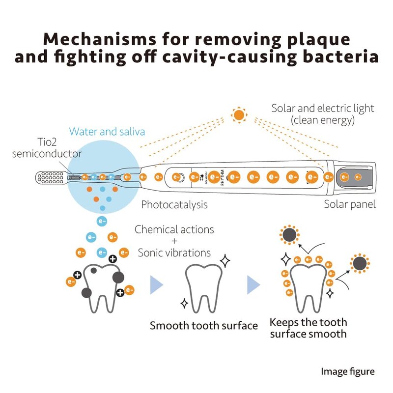 - Solar Panels and TiO2 Semiconductor: The brush effectively removes plaque by emitting large numbers of electrons. The electrons coat the teeth entirely, ensuring they remain sparkly clean even 12 hours after brushing. *Based on a test of cavity-causing bacteria adhesion using apatite pellets.