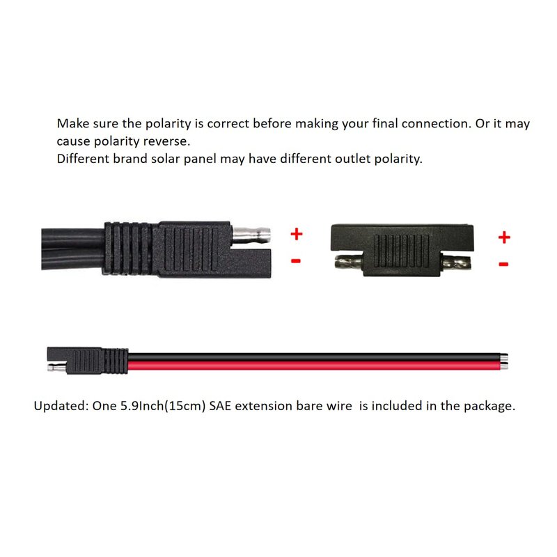- With 2pcs SAE to SAE polarity reverse adapters. The outlet cable connector’s polarity of different brand solar panel chargers maybe different. And the polarity may be reversed when the solar panels are connected with this cable. And this SAE to SAE connector would be the easiest way to make the reversed polarity correct.
