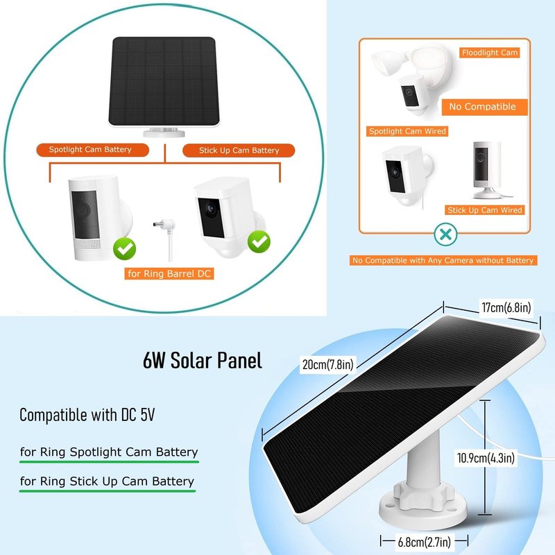Rhorawill 1 Pack Camera Solar Panel is only compatible with Ring Spotlight Cam Battery & Ring Stick Up Camera Battery 2nd and 3rd Generations for DC 5V port(Barrel Plug). Made of monocrystalline silicon wafers. With a 6W fast charging rating, It provides an ideal uninterrupted power source for your Ring camera, Continuously absorbing sunlight and converting it into electricity. This Camera solar panel does not work with any Ring Plug-In Camera that does not have a battery.