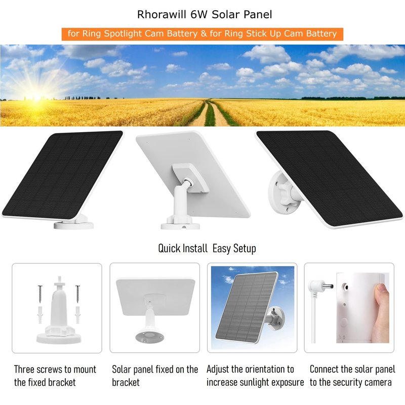 - 【All Day Solar Power】Rhorawill 1 Pack Camera Solar Panel is only compatible with Ring Spotlight Cam Battery & Ring Stick Up Camera Battery 2nd and 3rd Generations for DC 5V port(Barrel Plug). Made of monocrystalline silicon wafers. With a 6W fast charging rating, It provides an ideal uninterrupted power source for your Ring camera, Continuously absorbing sunlight and converting it into electricity. This Camera solar panel does not work with any Ring Plug-In Camera that does not have a battery.