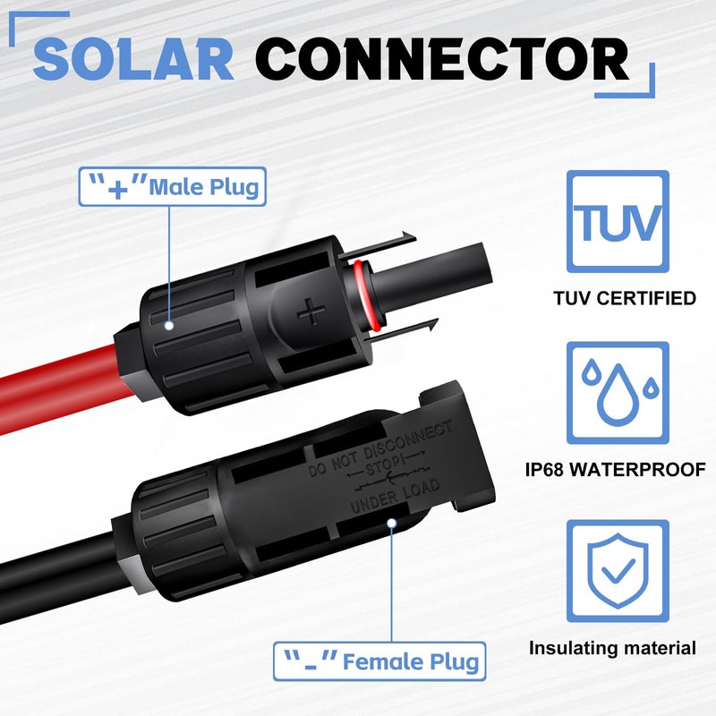 - 【Handy Adapter Good Cable, Good Plugs】The two solar connectors are very solid, engage positively, and with included gaskets are rated IP67 waterproof. These work great with the Renogy solar panels,Solid solar extension cable to charger.fits well and tight. weather resistant and good overall quality.