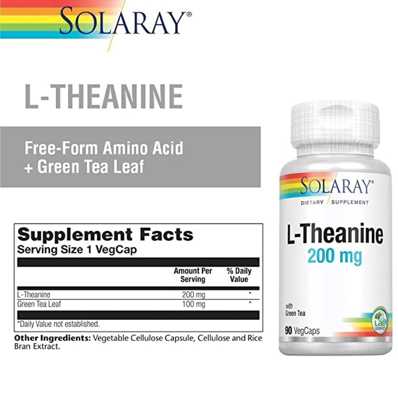 Solaray L-Theanine 200mg w/Green Tea Leaf 100mg Relaxation, Stress, Mood & Focus Support w/Out Drowsiness Lab Verified 90 VegCaps