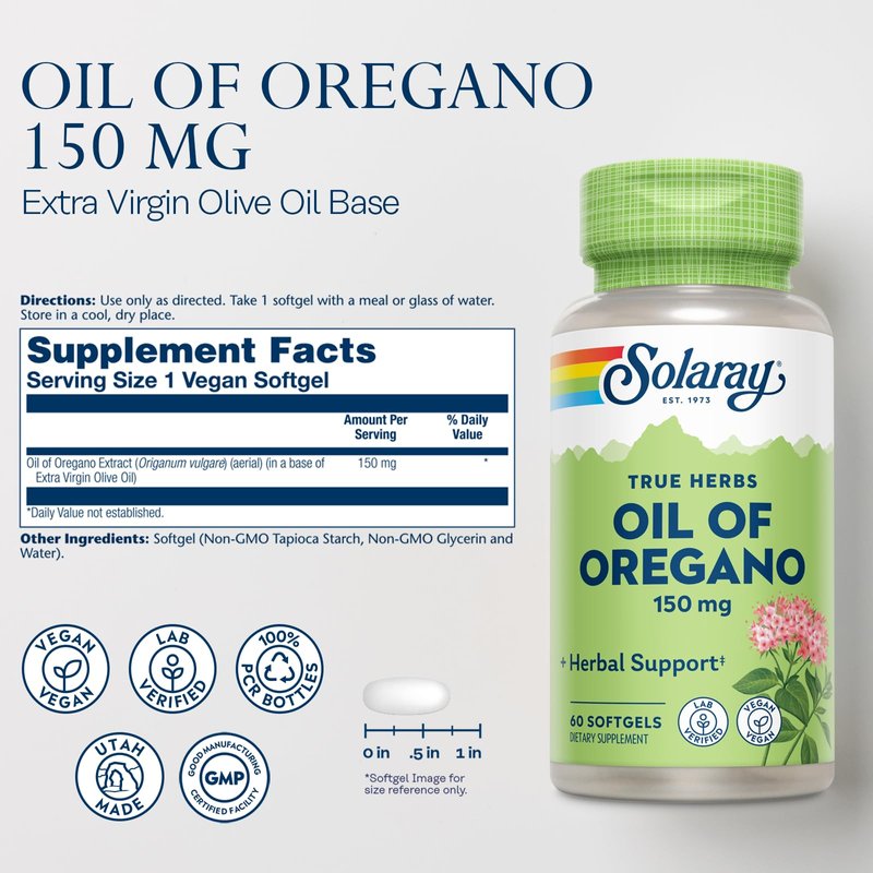 SOLARAY Oil of Oregano Softgels 150 mg - Oregano Oil Supplement for Powerful Wellness Support - Gentle Digestion - Extra Virgin Olive Oil Base - Vegan, 60-Day Guarantee - 60 Servings, 60 Softgels