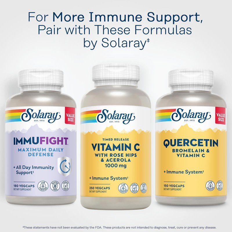 Radiate wellness from the inside out. Considered one of the most effective supplements you can take, Vitamin C 1000 mg may help support healthy immune system function, collagen synthesis, cartilage and bone development, central nervous system function, blood vessel integrity, and more! Your body also needs Vitamin C to produce a powerful antioxidant, glutathione, which may help support antioxidant processes in the body and cellular health. While you can find Vitamin C in many fruits and vegetables, the content of this essential vitamin can become depleted through cooking or storage methods. Supplementation can help you achieve optimal levels. Unlike other Vitamin C supplements, our innovative, timed-release formula is designed to release half the Vitamin C rapidly and the other half gradually throughout the day*. This two stage approach may help extend the availability of Vitamin C to the body over a longer period for sustained immune system support and high absorption. Great during the cold winter season, our formula includes rose hips and acerola cherry – two natural, sun-grown sources of Vitamin C and bioflavonoids that may help enhance absorption and support skin health. Like all Solaray products, our Timed-Release Vitamin C is lab verified for the potency and purity of its ingredients. Confidence in the Solaray name is just one of the reasons we’ve been around so long and maintain our place as a leader in the industry. Unlike many other companies, we manufacture almost all our own products, which gives us the ability to thoroughly test and screen raw ingredients for the slightest amount of impurities and manage the production process to provide the best possible quality. Rest assured, only the purest formulas ever reach your cabinet. *Based on in-vitro dissolution tests designed to simulate the digestive process. Individual results may vary. Vitamina c