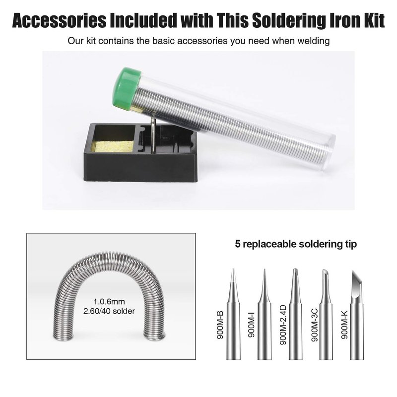 - 🎊【Must-have Soldering Iron Kit】Kit Includes soldering iron, tips,simple soldering iron stand, conventional sponge,solder wire,flux paste . A good basic soldering iron set that has all the materials you need to get started.