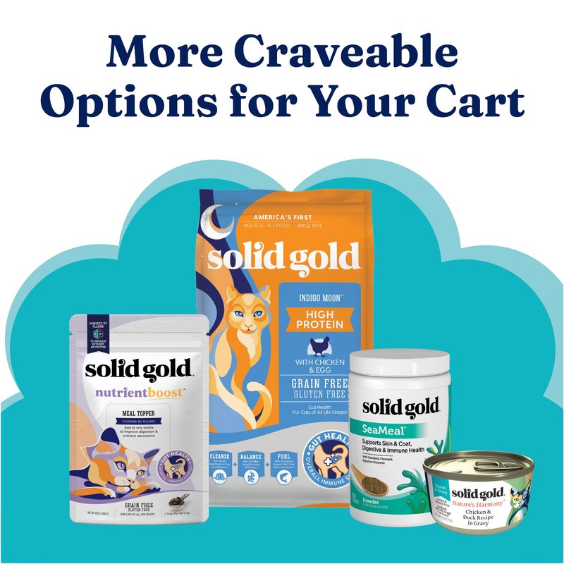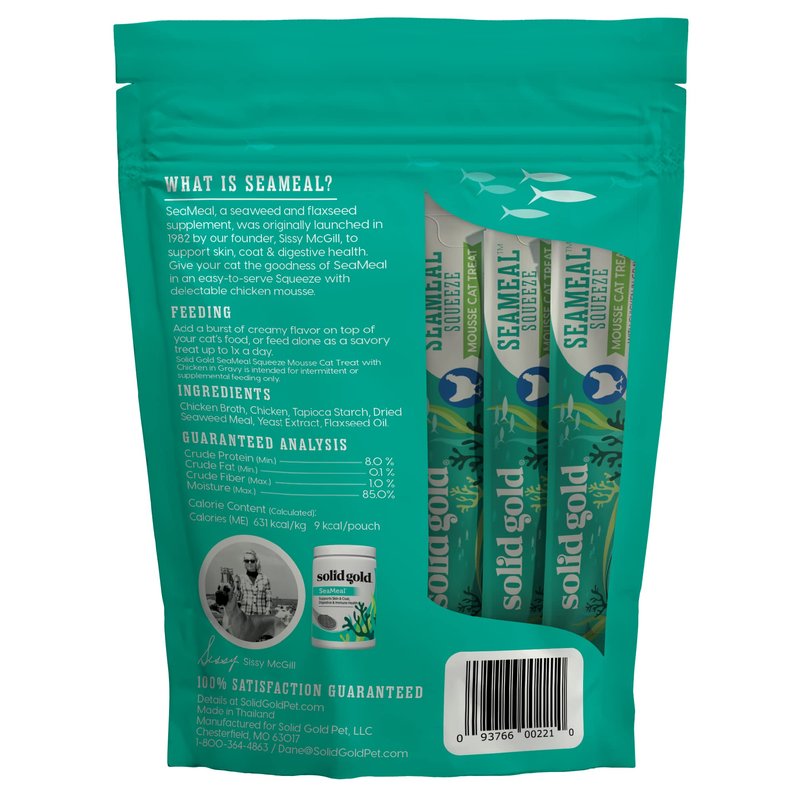 Solid Gold SeaMeal Squeezes are easy-to-feed cat treats with fiber-rich seaweed for digestive health and flaxseed for healthy skin and coat. Our founder, Sissy McGill was so confident of the power of seaweed that she created SeaMeal in 1982, a supplement with 5 different types of seaweed, flaxseed and digestive enzymes. For almost 40 years, SeaMeal has provided digestive health, immune health, and skin and coat health to both dogs and cats! Now, we are excited to give the goodness of SeaMeal in a tasty and easy-to-serve pouch that your cat will love. soft broth gravy freeze dried dry mix churu pate pill pockets bisque tube tubes lickables canned broths pouches chew meow salmon hairball creamy ilk organic soups stew shreds meaty minnows feline naturals grain moist liquid toppers snack yogurt