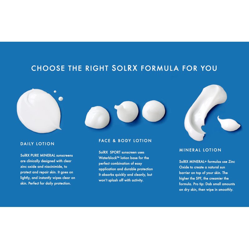 - HIGHLY WATER RESISTANT & SWEAT PROOF: SolRX MINERAL sunscreen has our patented WATERBLOCK formula, independently tested effective after 8 hours in water. It won’t sweat loose or run into your eyes. Non-greasy, hypoallergenic and applies evenly.